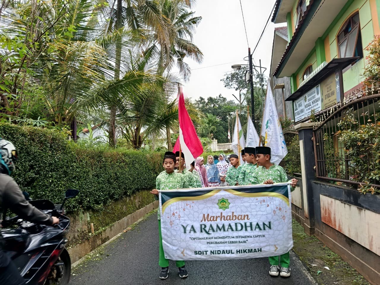 Pawai menyambut bulan suci Ramadhan oleh SDIT Nidaul Hikmah diikuti oleh siswa-siswi serta didampingi guru dan karyawan.